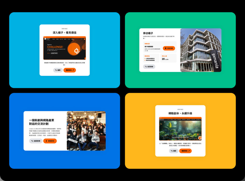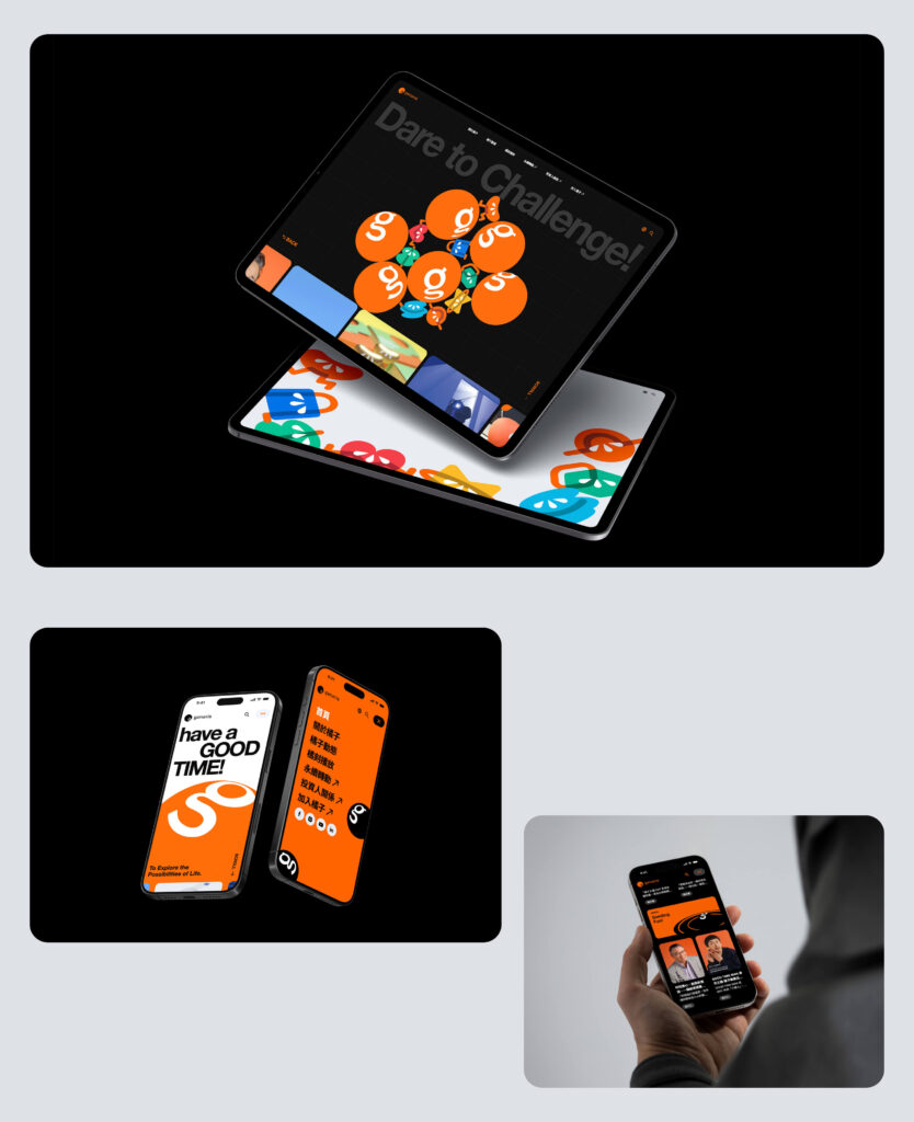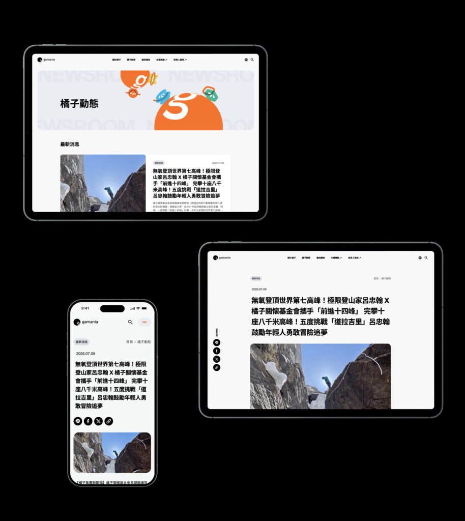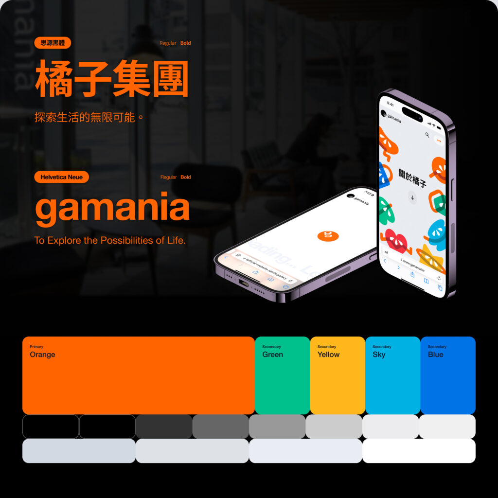 在首頁第一屏我們將品牌的關鍵元素 「gama globe」放置於視覺中心,打造兼具企業識別、品牌故事與用戶體驗的數位門面;全站更透過豐富的動態表現,翻玩企業識別系統,打造專屬橘子的視覺語彙,將過去的輝煌、現在的創新,到對未來的想像,都化為生動的數位體驗。